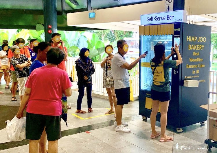 Here’s a good news: HYPHA, a vending stations provider in Singapore, brings the banana cakes over from Johor Bahru and sells them through their unmanned vending machine (or Self-Serve Bar) — at Senja Hawker Centre in Bukit Panjang. Since its launch on 17 May 2025, the Self-Serve Bar has been drawing long queues to get its banana cakes, which sold out fast after every stock-up.